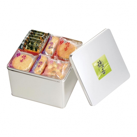 あられ、おせんべい、海苔巻をバラエティ豊かに缶に詰め合わせました。